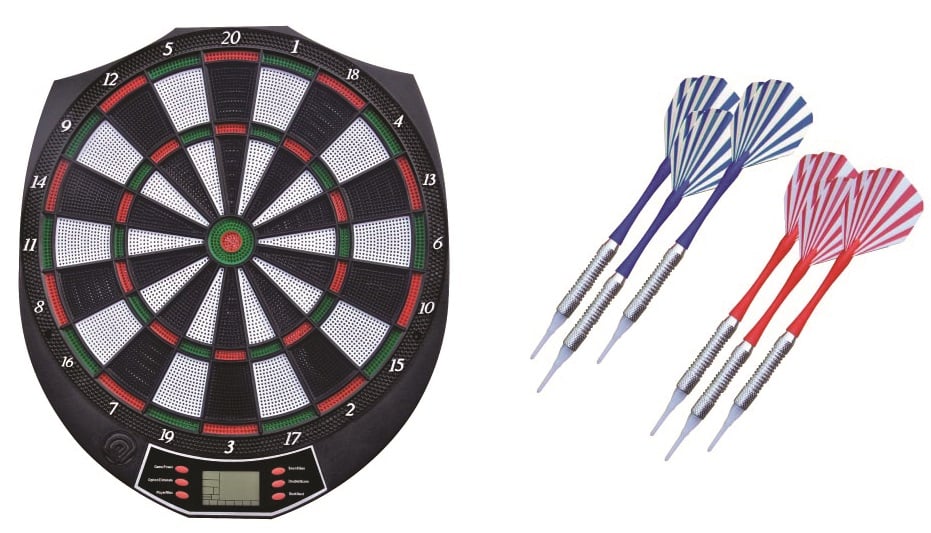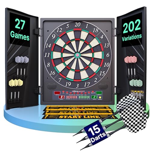 Ultrasport Elektronisk darttavla från med dörrar, Classic Dart för 16 spelare, dartspel med LED-display, 38 spel och många variationer/darttavla inklusive 12 mjukpilar och låsbara dörrar