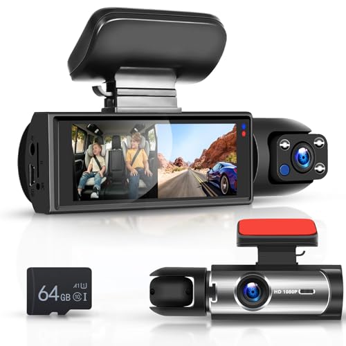 Hodozzy Dash Cam Fram Och Inuti För Bilar, 64G SD-Kort, FHD 1080p Bilkörningsinspelare 3,16 Tums Vidvinkel Instrumentpanelkamera, G-Sensor, Parkeringsövervakning, Loopinspelning, Mörkerseende Dashcam