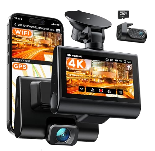 Dash Cam Auto 4K+1080P, infogat 32B-kort, 3-kanals kamera 170° vidvinkel, WiFi bilkamera, super-Dashcam med mörkerseende, Dash Cam för med loop-inspelning