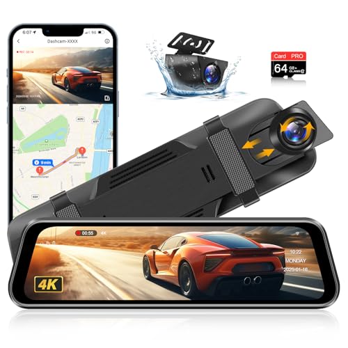 4K spegelbilkamera backspegelkamera med 64G SD-kort backkamera spegelbilkamera med 10" IPS pekskärm dashcam bil fram bak 170° vidvinkel WDR loopinspelning G-sensor