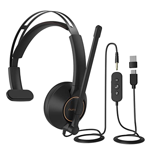Nuroum HP11-SU USB-headset med mikrofon för bärbar dator, 270° roterbar bommikrofon, in-line-kontroll, USB-A/Typ-C/3,5 mm till PC/Mac/mobil för zoom/team samtal/konferens, enkelörat hörlurar (mono)