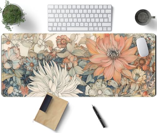Japansk minimalistisk blommig skrivbordsmatta estetiska blommor XL stor utökad spelmusmatta med sydda kanter, stort laptop-datortangentbord och musmatta för flicka kvinnor kontorsdekor 80 x 30 cm