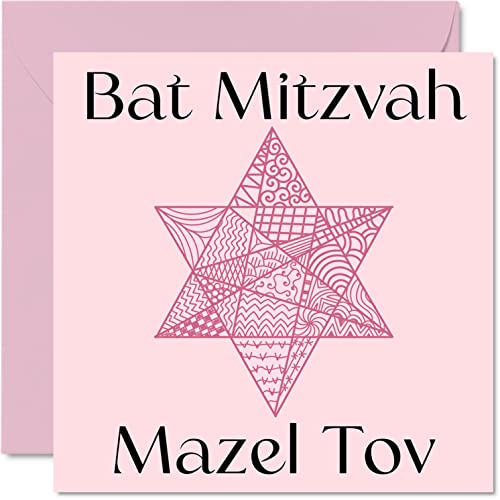 Fladdermus Mitzvah-kort för flickor henne – Zentangle Davidsstjärna – Mazel Tov, lycka till gratulationsgåvor, fladdermus Mitzvah-gåvor för flickor, 145 mm x 145 mm judiska gåvor gratulationskort bar Mitzvah-kort