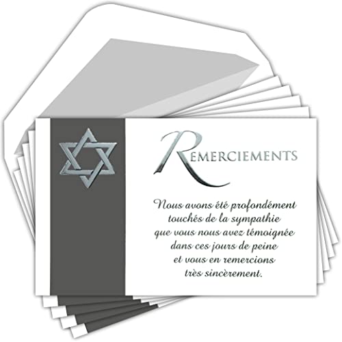 C5271 Tack judisk kondoleanser set 5 identiska kort silver text + 5 vita kuvert format 9 x 14 cm symbol Davidsstjärna dödsfall begravning sorgpåse tillverkad i Frankrike AFIE