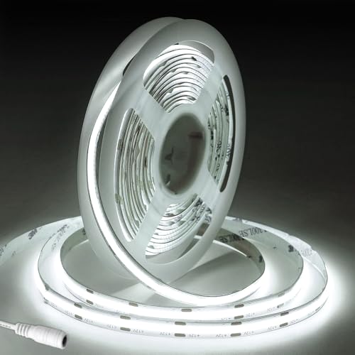 Fosingut COB LED-remsa 5m,DC12V 8mm LED Strip Kallvit 6500K,CRI90+ 480LED/m Remsor ljuskedja,Flexibel Självhäftande repljus neonljus för TV-bakgrundsbelysning,Kök,Sovrum,DIY Dekor(Endast Strip)