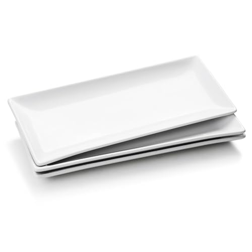 WishDeco Serveringsfat, Vitt, Rektangulärt, Stora Porslinstallrikar, Set Med Rektangulära Tallrikar, Avlånga Serveringsplattor, Mattallrikar för Kött, Fisk Och Biff, Set om 3 (36 x 15 cm), Stapelbara