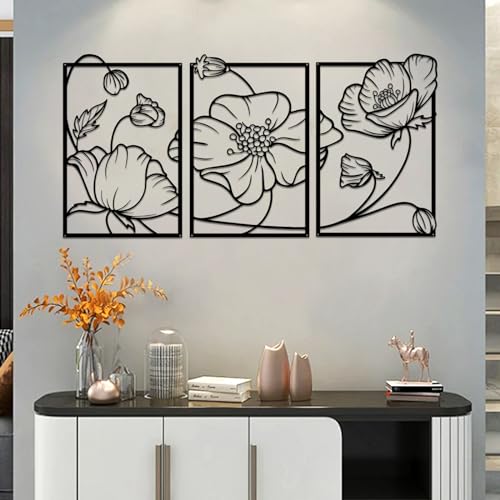 YiYa 3 stycken väggdekoration i metall blomma vägg dekor blommig linje väggskulptur svart väggdekoration minimalistisk linje konst för hem vardagsrum sovrum