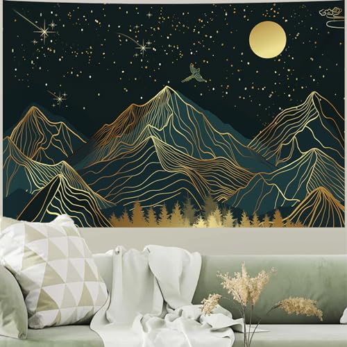 Atrippy Berg gobeläng för sovrum, grön skog måne träd stjärnklar natt rum dekor vägg gobeläng, guld natur stjärnor landskap gobelänger estetiska för vardagsrum sovsal kontor 102 cm x 152 cm