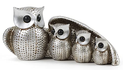 FriyGardcn Söt silverfamilj med fyra ugglefigurer heminredning uggla skulptur med tre babyugglor dekor för hylla uggla gåvor dekoration för uggleälskare hem, kontor, boksjälv..