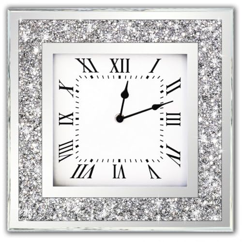 DMDFIRST Kristall krossad diamant speglad fyrkantig väggklocka med gnistrande blinkande bling dekor för dekoration, 40 x 40 cm dekorativ silver spegel kvarts heminredning. AA-batteri ingår inte