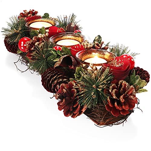 COM-FOUR® värmeljushållare - dekorativ ljushållare för jul och höst - Ljusstake med naturmaterial - hantverk (Adventsarrangemang röd blomma - 3 ljus)