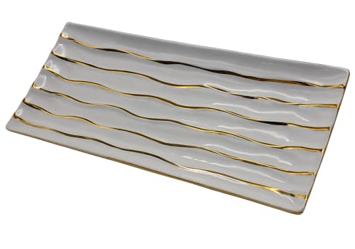 Högkvalitativ keramisk skål/dekorativ skål i vitt med gyllene linjer, rektangulär, storlek 38 x 17 x 3 cm