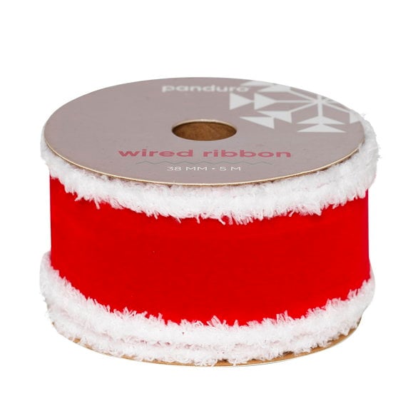 Rött dekorband med vit fluffig kant, stålkant – 38 mm brett och 5 meter långt