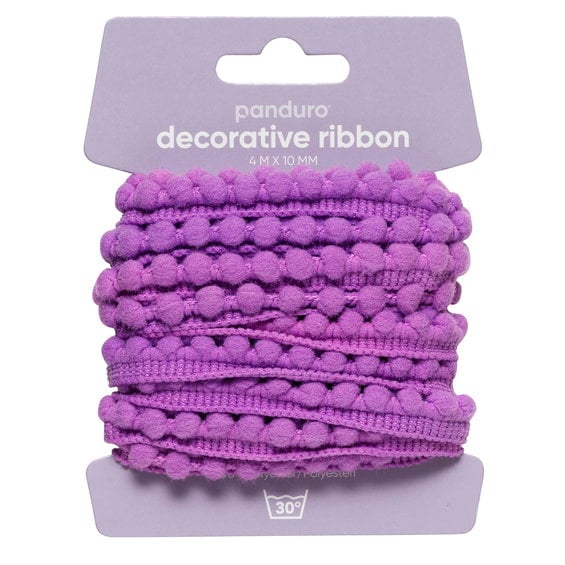 Pompom-band dekorband lila, 4 m långt och 10 mm brett