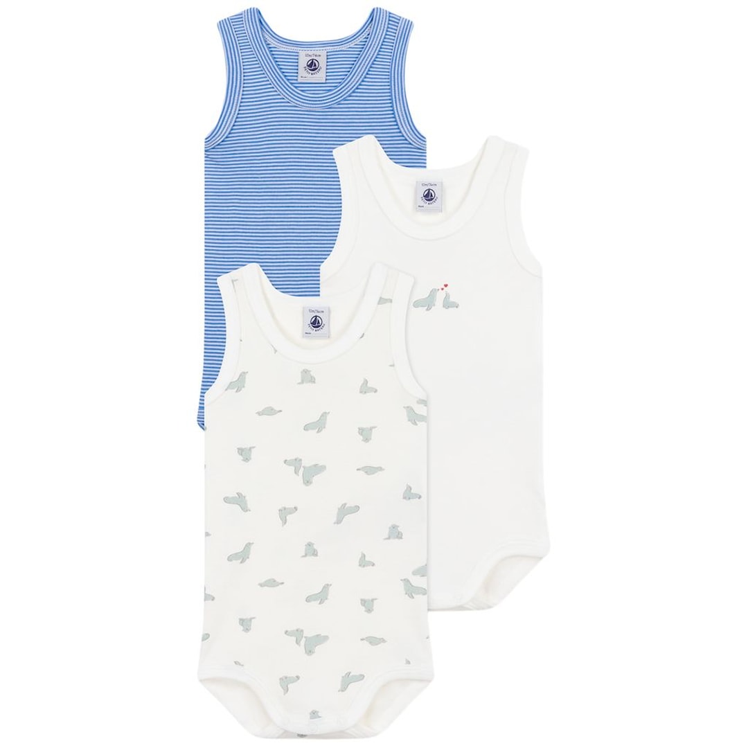 Petit Bateau 3-pack Ärmlösa Baby Bodys Delphinium Marshmallow 3 months Blå 3 månader unisex
