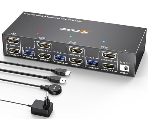 USB 3.0 HDMI KVM-switch 3 PC 2 bildskärmar, EDID-emulator, 4K@60Hz utökad skärm, HDMI 2.0, Dual Monitor KVM-switch 3 PC-delar trådlöst tangentbord, mus, skrivare, med trådad fjärrkontroll och 5