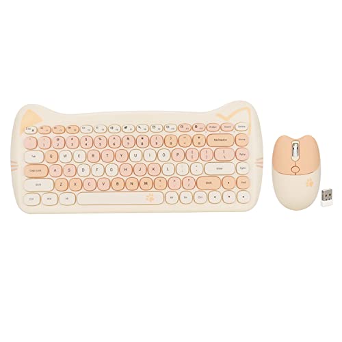 Trådlöst Tangentbord Mus Combo, 2.4G USB Ergonomisk Kattform Blandad Färg Söt Fullstorlek Tangentbord och Mus för Dator Stationär PC Bärbar Dator(Mjölk te färg)
