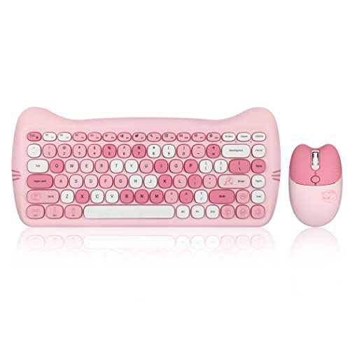 Perixx PERIDUO-715 trådlöst mini tangentbord och mus set – söt kattliknande design – rosa godisfärger – bärbar resväska – typ-C adapter – US engelska