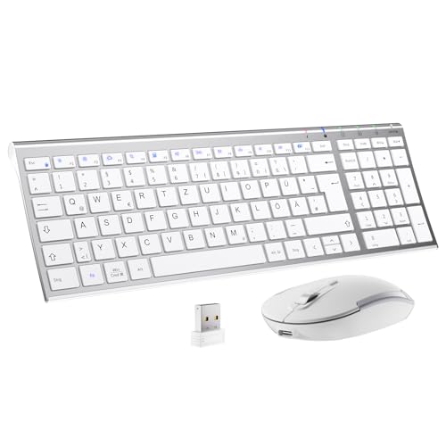 IClever trådlöst tangentbord musset, uppladdningsbart trådlöst tangentbord och mus, QWERTZ-layout (tyska ultratunt för dator/stationär dator/PC/laptop/Windows 10/8/7, vitt och silver