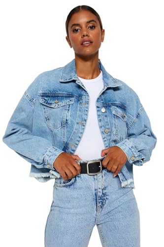 Trendyol Light Skirt Tip Tassels Crop Denim jacka för kvinnor, klar blå, Genomskinlig blå, L
