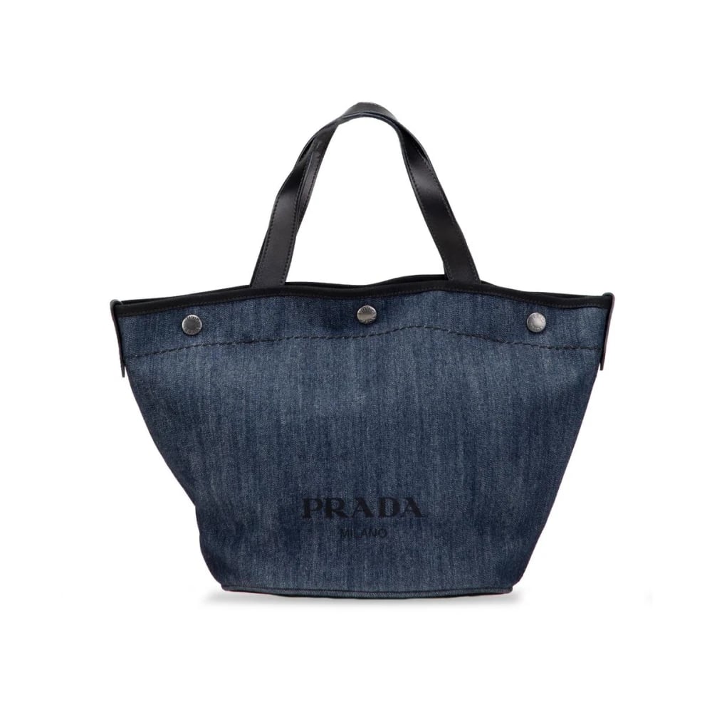 Prada Vintage, Vintage , Dam, ONE Size, Denim, Förägd Denim Toteväska med Topp Handtag Öppen Topp och Knappdetaljer