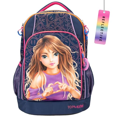Depesche 12739 TOPModel Night Light – skolryggsäck i mörkblått med modellmotiv, skolväska med justerbara remmar och hängen