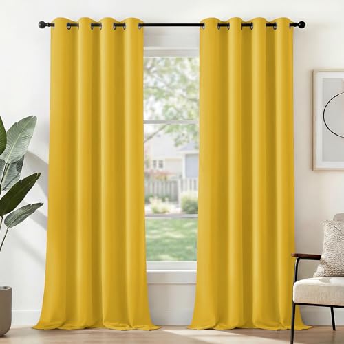 Deconovo Mörkläggningsgardiner, värmeisolerade mörkläggningsgardiner, gardiner för flickrum, modern design med öljetter, 140 x 270 cm (bredd x höjd), senapsgul, 2 stycken