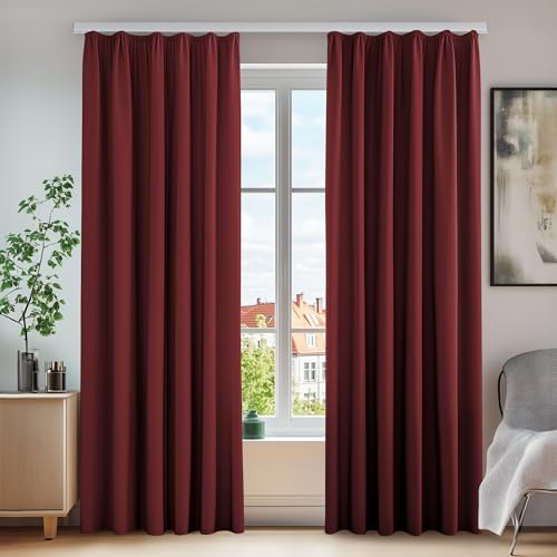 Deconovo Mörkläggningsgardiner, värmeisolerade, kalla gardiner, 140 x 180 cm (bredd x höjd), gardiner för flickrum, modern design med öljetter, nr l mörkröd, 1 st
