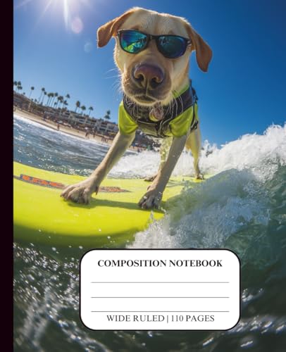 Dog Notebook for Kids Ages 8-12 Wide Ruled Composition Journal for Boys Teens School Supplies Handwriting Middle High Homeschool Creative Writing ... Black Design Theme Cover Yellow Lab Surfing