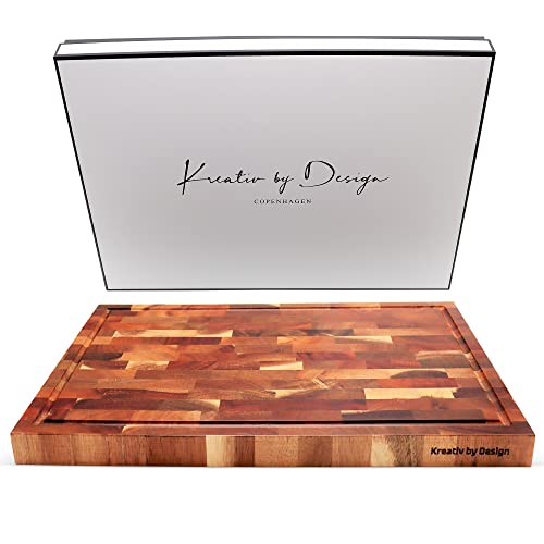 KREATIV BY DESIGN Grain Acacia trä skärbräda med Juice Groove | Stor tjock ände korn akacia trä slaktarblock | Skärbräda | Charcuterie Board | ostbräda | serveringsbräda