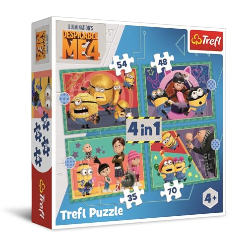 Trefl - Despicable Me 4, Galna Minioner - Pussel 4i1, 4 Läggspel, från 35 till 70 bitar -Olika svårighetsgrader, Färgglatt pussel med sagans karaktärer, Kreativ underhållning, Lek för barn från 4 år