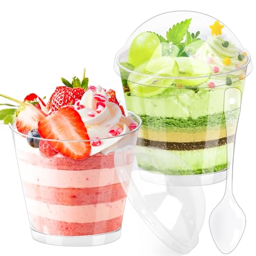 PALUDO 50 Stycken Mini Dessertkoppar med Lock och Skedar, 150ml Dessertglas Plastic Dessertkoppar Klara, Återanvändbara Dessertkoppar Set för Moussepudding Bröllopsfest