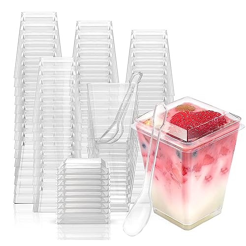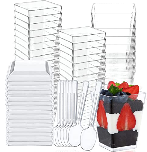 Fousenuk 50 stycken dessertglas med skedar plast, 60 ml dessertskålar skålar klar återanvändbara, fyrkantiga dessertkoppar, för pudding mousse glass födelsedag bröllop