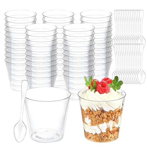 NCKIHRKK 60 stycken dessertglas, 160 ml dessertskålar, set med 60 stycken skedar, återanvändbara dessertkoppar plast för dessertfest, pudding mousse, glassbägare