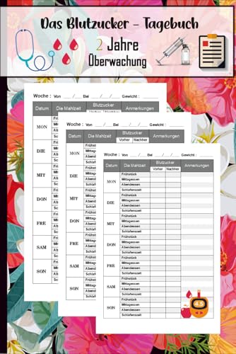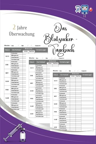 Diabetes Tagebuch: Tagebuch für Diabetiker für 104 Woche (2 Jahre) zur täglichen Überwachung von Blutzuckerwerten - und Insulinwerten mit praktischem Wochenplaner -typ 1 - Geschenk für Diabetiker .