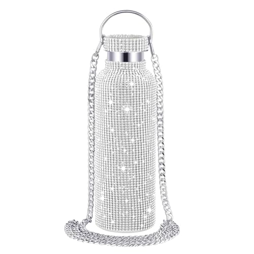 BRIOTA Bling diamantvattenflaska, 750 ml vattenflaska i rostfritt stål med kedja, silver dubbelfoder vakuumisolerade flaskor, blank diamant termisk flaska för kvinnor och flickor gåvor