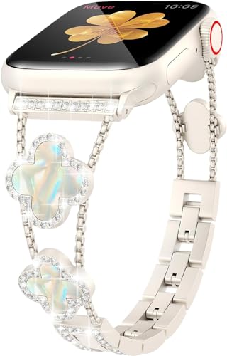 Bling Diamond Lucky Clover Kvinnor Armband Kompatibelt med Apple Watch Armband 38mm 40mm 41mm 42mm 42mm 45mm 46mm Serie SE 10 9 8 7 6 5 4 3 2 1, Sött Klänning Glittrande Diamantarmband