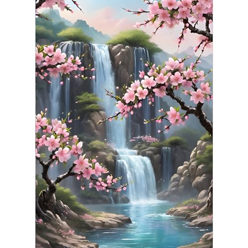 GDYEEH Peach Blossom Diamond Art Painting Kits, 5D DIY Vattenfall Full Round Drill Sparkling Diamantmålning, Diamantmålning, Konst Hantverkssatser för Vuxna, Nybörjare, Heminredning, 30 x 40 cm