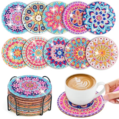 10 stycken diamantmålningsunderlägg med hållare, diamantkoppunderlägg, mandala Diamond Art Painting, 5D gör-det-själv mandalamala-underlägg, halkfria för nybörjare, vuxna och barn
