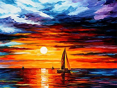 Diamond Painting Set, bild med segelbåt i solnedgången och tillbehör, pysselset för målning med glittrande stenar för barn från 5 år