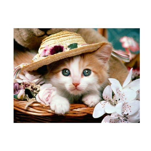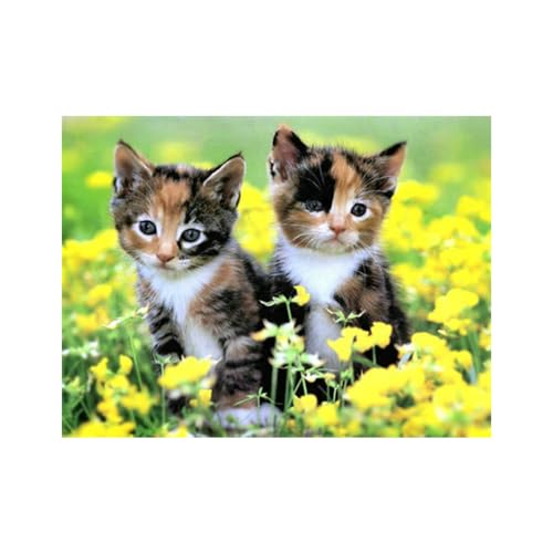 Diamond Painting Set, målning med kattunge i ett fält av blommor och tillbehör, pysselset för målning med glittrande stenar för barn från 5 år