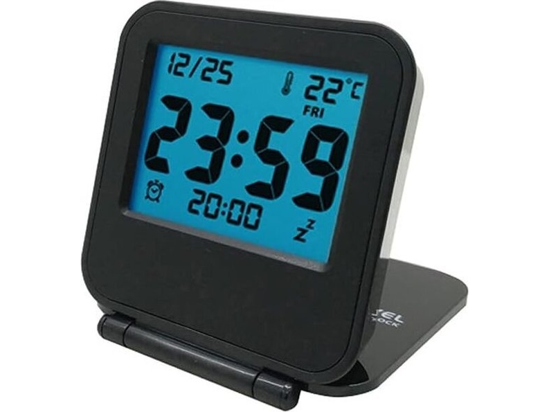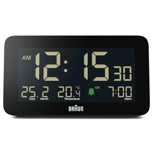 Braun Digital Alarm Clock with Date, Month and Temperature Displayed, Negative LCD Display, Quick Set, Crescendo Beep Alarm in Black, model BC10B.