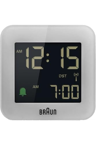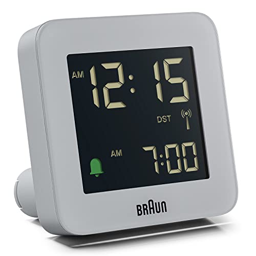 Braun Digital Radio Controlled Travel Alarm Clock For Central European Time Zone (DCF) with Snooze, Compact Size, Negative LCD Display, Quick Set, Crescendo Beep Alarm in Grey, model BC08G-DCF.