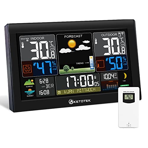 KETOTEK Trådlös inomhus-/utomhusväderstation med sensor VA-display digital termometer hygrometer, DCF-radioväckarklocka, barometer, väderprognosa, soluppgång solnedgång i staden, månfas