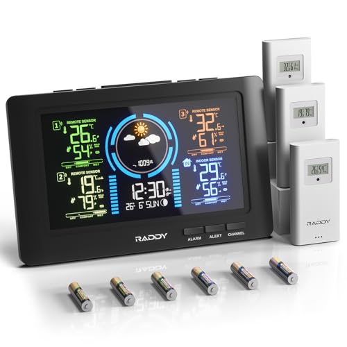 Raddy WF-80C väderstation trådlös med 3 utomhussensorer 7,5 tum digital färgskärm, termometer hygrometer barometer, med DCF-radioklocka, väderprognos, justerbar bakbelysning