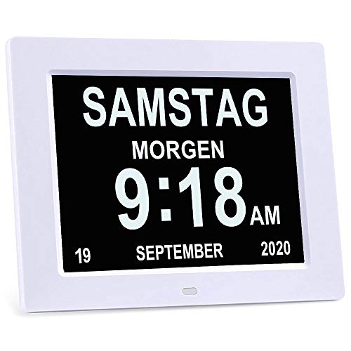 Adiwo 8 tums LCD-klocka digital kalender, 8 språk dimbar fjärrkontroll elektronisk klocka med datum dag och tid och digital fotoramfunktion, för Alzheimers sjukdom