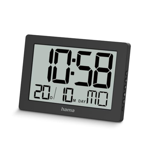 Hama väggklocka digital (visning, kalender, veckodag, 7 språk, displaydisplay i timmar och minuter, med utfällbart stativ för användning som bordsklocka, inklusive batterier) svart
