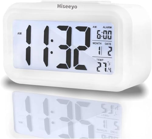 Hiseeyo Uppgraderad digital väckarklocka, 4,3 tum LED-display med temperatur större lound Light Control bärbar snooze kalender ljusstyrka med batteridriven väckarklocka sängbord (vit)