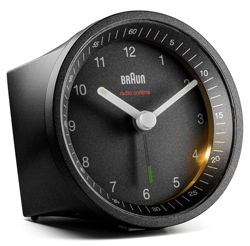 Braun Classic Radio Controlled Analogue Alarm Clock For Central European Time Zone (DCF/GMT+1) with Snooze and Light, Quiet Movement, Crescendo Beep Alarm in Black, model BC07B-DCF.