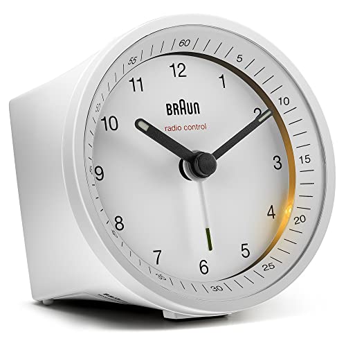 Braun Classic Radio Controlled Analogue Alarm Clock For Central European Time Zone (DCF/GMT+1) with Snooze and Light, Quiet Movement, Crescendo Beep Alarm in White, model BC07W-DCF.